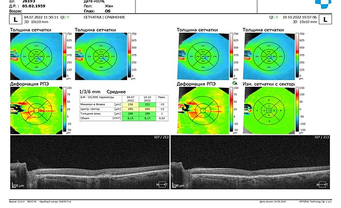 Рис. 1. Протокол ОКТ пациентки Ц. - группа ОГ-1 до и после лечения Степень тяжести нарушений светочувствительности оценивали с помощью компьютерной периметрии по среднему повышению или снижению световой чувствительности в обобщенном поле зрения MD (Mean defect) по сравнению с возрастной нормой и sLV - маркеру степени однородности дефектов поля зрения (Loss variance). У пациентов в подгруппе ОГ-1 MD регистрировались в пределах нормы (0,65±0,7 дБ), после лечения наблюдалось значительное улучшение светочувствительности сетчатки: MD составила 0,21±0,6 дБ, (р=0,03), а в подгруппе ОГ-2 значимых изменений не обнаружено (рис. 2, табл. 1). Индекс sLV в подгруппах ОГ-1 и ОГ-2 выходил за рамки референсных значений (>2,5 дБ). После лечения зарегистрировано значимое улучшение - уменьшение дефекта в подгруппе ОГ-1 от 3,05±0,36 до 2,59±0,20, р=0,04 и тенденция к улучшению в подгруппе ОГ-2 с 4,93±1,09 до 4,63±1,13, р=0,05 (рис. 2, табл. 1).