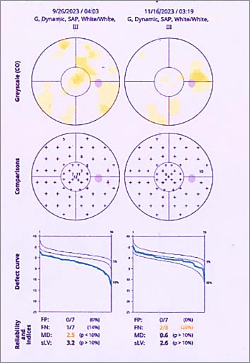 Рис. 2. Протокол компьютерной периметрии пациента Г. группы ОГ-1 до и после лечения Cредние значения показателей внутриглазного давления у пациентов в обеих подгруппах до начала терапии варьировали от 11 до 23 мм рт. ст., находились в пределах нормальных значений и существенно не изменялись после курса лечения. В 48 % случаев у пациентов обеих групп была снижена слезопродукция (менее 9 мм), что соответствовало средней степени синдрома сухого глаза, после курса лечения в 12 % случаев было отмечено увеличение слезопродукции. Средние значения показателя значимо не изменялись независимо от стадии ВМД. Результаты значений показателей клинико-лабораторных методов исследования сравнивали с таковыми у условно здоровых пожилых людей, проживающих в Приморском крае, определяемые как интервал исследуемого признака, включающего по одному и двум среднему квадратическому отклонению от среднего значения (M±1SD, M±2SD), при ненормальном распределении - как интервал значений между установленными произвольно нижними и верхними процентилями общего диапазона Ме (25-75 %), Ме (5-95 %). Показатели клинического анализа крови пациентов опытной группы в целой выборке до начала исследований находились в границах значений диапазона показателей у условно здоровых пожилых людей и не выходили за рамки широкого нормативного диапазона, за исключением СОЭ (скорости оседания эритроцитов). Медиана СОЭ значимо превышала показатели в контрольной группе и оставалась повышенной после лечения (p<0,05) (табл. 2). Значимых различий между показателями на ранней и поздней стадиями заболеваний не выявлено. Средние значения биохимических показателей всех обследуемых пациентов с ВМД также находились в пределах референсных значений и значимо не отличались от таковых у условно здоровых людей (табл. 2). В то же время уровень общего холестерина в сыворотке крови всех обследуемых пациентов с ВМД в 50 % случаев был выше верхней границы широкого нормативного диапазона. После курса лечения значимого изменения в содержании холестерина не отмечено, в том числе у пациентов с исходно повышенными показателями (6,35±0,11 ммоль/л и 6,09±0,26 ммоль/л). Содержание глюкозы в сыворотке крови всех обследуемых пациентов с ВМД находились в интервале от 4,00 ммоль/л до 8,20 ммоль/л. Повышенные уровни глюкозы регистрировались у 4 пациентов. Средние значения показателей, характеризующих функциональное состояние гепатобилиарной системы и функцию почек, находились в границах нормативного диапазона. До начала лечения у всех обследуемых пациентов с ВМД выявлены значимые различия средних значений показателей азотистого обмена (мочевины) по сравнению с показателями у условно здоровых людей. У пациентов с поздней стадией ВМД изменения были более выраженными, показатели значимо отличались от таковых у пациентов с ранней стадией ВМД и условно здоровых людей, и оставались повышенными после окончания терапии (табл. 2). Показатели общей антиоксидантной активности сыворотки крови (ОАО) пациентов с ВМД до лечения значимо не отличались от таковой у условно здоровых пожилых людей и не изменились после терапии. Средние значения показателя, характеризующего базовый уровень С-реактивного белка (СРБ) и концентрацию фибриногена - маркеров воспаления - до начала лечения в обеих подгруппах находились в пределах нормативного диап