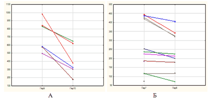 Рис. 3. Содержание VEGF в сыворотке крови пациентов с ранней и поздней стадиями ВМД с исходно повышенными (А) и нормальными (Б) показателями до и после лечения. По оси ординат - концентрация VEGF (ммоль/л)