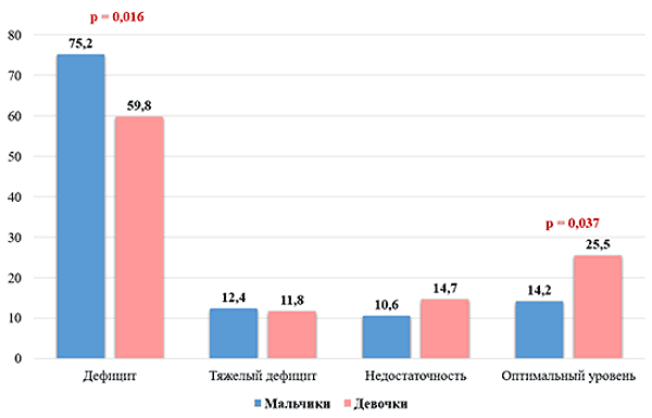 Рис. 1. Гендерные особенности обеспеченности детей витамином D В продольном исследовании Fit Futures [19], проведенном в Норвегии (69° с. ш.), представлены данные подростковой популяции Арктики. Распространенность дефицита витамина D у детей в возрасте 16-18 лет колебалась в диапазоне от 73,7 % до 77,1 %, тяжелый дефицит диагностировался до 40,9 % случаев и дефицит витамина D чаще встречался у мальчиков 16 и 18 лет в сравнении с девочками (соответственно 82,5 % и 86,4 % против 65,7 % и 68,6 %). Полученные данные в норвежском исследовании согласуются с результатами нашего анализа и демонстрируют однонаправленный тренд высокой распространенности низкого статуса витамина D у подростков-мальчиков, проживающих в высоких широтах. Полученные в результате исследования данные о высокой частоте неадекватной обеспеченности витамина D у детей, проживающих в условиях Арктики, еще раз подтверждают тот факт, что единственным путем решения проблемы дефицита витамина D у жителей высоких широт является его алиментарная дотация. В исследовании Rios-Leyvraz M. и соавторов [20], проведенного под эгидой Всемирной организацией здравоохранения и Продовольственной и сельскохозяйственной организации (WHO/FAO), представлены результаты нового многоуровневого и многофакторного моделирования реакции концентрации 25(OH)D в сыворотке крови на общее потребление витамина D у детей младше 4 лет. С точки зрения безопасности прием холекальциферола в дозе 35 мкг (1400 МЕ) в день будет поддерживать концентрацию сывороточного кальцидиола почти у всех детей младшего возраста (98,6 %) на адекватном уровне [20]. Рекомендуемые ежедневные профилактические дозы для подростков могут достигать 4000 МЕ в зависимости от сезона, пигментации кожи, потребления продуктов, обогащенных витамином D, индекса массы тела и наличия сопутствующих заболеваний [21].