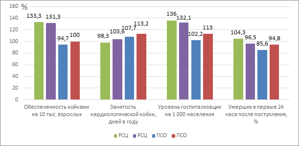 За 5 лет реализации федерального проекта "Борьба с сердечно-сосудистыми заболеваниями" общее количество ПСО в РФ практически не изменилось (в 2019 - 530, в 2023 - 536 единиц; +1,1 %). Коечный фонд ПСО составил 21 222 койки, что оказалось на 16 % меньше, чем в 2019 г. (табл. 1). С ростом общего числа РСЦ на 36 % (со 162 до 252) количество коек выросло на 41 % (с 17 199 до 24 295). В целом по стране коечный фонд кардиологических отделений с 2019 г. за 5 лет снизился на 7 % с 46900 (2019 г.) до 43 662 (2023 г.), по данным ФФСН № 30, и на 5 % (с 47216 до 44 857).