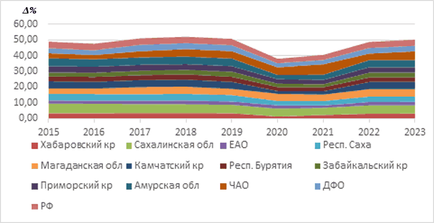 Рис. 2. Тенденции обеспеченности кардиологическими койками для взрослых в РФ и ДФО, 2015-2023 гг. Общая динамика обеспеченности кардиологическими койками для взрослых не указывает на принципиальное влияние на данный показатель пандемии COVID-19 в РФ в целом (плавное снижение весь период наблюдения), в отличие от ДФО, где показатель рос с 2015 по 2019 год, далее отмечалось снижение показателя. В 5 субъектах ДФО в данный период отмечался рост показателя, в 6 - его снижение и в целом по региону составило в период 2019-2023 гг. 5,3 % (табл. 3, рис. 2).