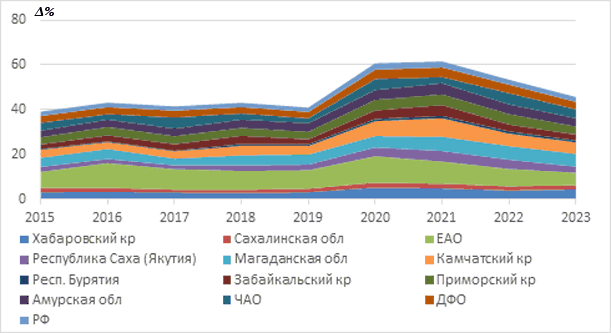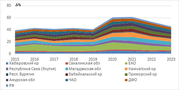 Ключевым вектором государственной демографической политики государства стало обеспечение устойчивого роста численности населения РФ, что закреплено в национальных целях развития РФ до 2030 года [1]. Борьба с болезнями системы кровообращения (БСК), составляющими общемировую проблему в сохранении здоровья населения и его потенциала, является одной из приоритетных задач социальной политики Российской Федерации (РФ) [2, 3,4]. За период с 2019 по 2024 годы динамика смертности населения РФ от БСК имела неоднозначную тенденцию, снизившись в итоге на 3,1 % (до 555,3 на 100 000 населения). При этом регистрируется рост уровня смертности от БСК в тот же период среди населения в возрасте от 30 до 44 лет со 152,7 до 162,1 случая на 100 тыс. жителей на 6,2 %. В Дальневосточном федеральном округе (ДФО) смертность от БСК в 2022 году превысила средний уровень смертности по стране, а смертность трудоспособного населения в регионе от ишемической болезни сердца почти в 2 раза превышала общероссийский показатель [5, 6, 7]. В 2023 году уровень смертности от БСК на Дальнем Востоке также превышал средний показатель по стране на 1,2 %, а за 5 предыдущих лет вырос на 2,4 %. Современные вызовы требуют принятия новых научно обоснованных решений в поиске инструментов трансформации систем здравоохранения субъектов ДФО в горизонте стратегического планирования до 2046 года на федеральном и региональном уровнях для обеспечения доступной, качественной и безопасной медицинской помощи [8, 9]. В этой связи авторами изучены показатели деятельности медицинских организаций, оказывающих помощь в стационарных условиях населению с болезнями системы кровообращения, проживающих на труднодоступных территориях. Цель исследования: изучить динамику показателей деятельности медицинских организаций Дальнего Востока, оказывающих помощь в стационарных условиях при болезнях системы кровообращения.