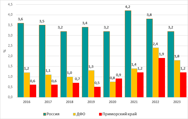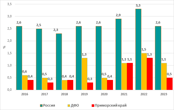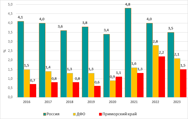 Рис. 2. Доля мигрантов среди лиц мужского пола, у которых впервые был выявлен ТБ, Россия, Дальневосточный федеральный округ (ДФО) и Приморский край, 2016-2023 гг., % В ДФО в 2016-2023 гг. доля мигрантов среди мужчин, у которых был впервые выявлен ТБ, составляла от 0,9 до 2,8 %, что в среднем было равно 1,6 %, что было в 2,4 раза меньше по сравнению с ее значением по России (рис. 2). Сравнение средних величин доли мигрантов среди мужчин, у которых был выявлен ТБ в 2016-2023 гг. в России и ДФО показало, что доля мигрантов среди мужчин была достоверно выше в России, чем в ДФО (М1=3,9; М2=3,1; ДИ1= [3,4; 4,3]; ДИ2= [-0,5; 6,6], р<0,005). В Приморском крае доля мигрантов среди мужчин, у которых был впервые выявлен ТБ в 2016-2023 гг., находилась в диапазоне от 0,6 до 2,2 %, что в среднем было равно 1,1 %, и тем самым в 3,5 раза превышало значение таковой по России и в 1,5 раза по ДФО. Сравнение средних величин доли мигрантов среди лиц мужского пола, у которых впервые в ДФО и Приморском крае в 2016-2023 гг. был выявлен ТБ, установлено, что доля мигрантов среди мужчин в ДФО была достоверно выше, чем в Приморском крае (М1=3,1; М2=1,1; ДИ1= [-0,5; 6,6]; ДИ2=[0,5; 1,7], р<0,005). В России за период с 2016 по 2023 гг. доля мигрантов среди женщин, впервые заболевших ТБ, была низкой на протяжении всего периода наблюдения и в среднем составляла 2,7 % (рис. 3).