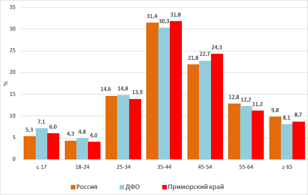 Рис. 3. Доля мигрантов среди лиц женского пола, у которых впервые был выявлен ТБ, Россия, Дальневосточный федеральный округ (ДФО), Приморский край, 2016-2023 гг., % В ДФО за этот же период времени доля мигрантов среди женщин, впервые заболевших ТБ, была низкой и не превышала 0,9 %, что было в 3 раза ниже по сравнению с общероссийским значением (рис. 3). При сравнении средних величин доли мигрантов среди женщин, впервые заболевших ТБ, в России и ДФО, установлено, что доля мигрантов среди женщин в России была достоверно выше по сравнению с ДФО (М1=2,7; М2=0,9; ДИ1= [2,4; 2,9]; ДИ2= [0,3; 1,4], р<0,001). В Приморском крае доля мигрантов среди женщин, впервые заболевших ТБ, была крайне низкой и в среднем за 2016-2023 гг. составляла 0,6 %, что было в 4,5 и 1,5 раза ниже по сравнению с таковой по России и ДФО. При сравнении средних величин доли мигрантов среди женщин, впервые заболевших ТБ, в ДФО и Приморском крае, достоверных различий обнаружено не было (М1=0,9; М2=0,6; ДИ1= [0,3; 1,4]; ДИ2=[0,15; 1,02], р>0,05). Анализ возрастной структуры впервые выявленных пациентов с ТБ в России, ДФО и Приморском крае в 2023 г. не выявил существенных различий между ними. Доля 4 возрастных групп - 25-34, 35-44, 45-54 и 55-64 года составляла более 80 %. Среди них наибольшая доля приходилась на возрастную группу 35-44 года, которая составляла в России - 31,4, в ДФО - 30,3 и Приморском крае - 31,8 % (рис. 4). Далее следовала группа 45-54 года, доля которой составляла в России - 21,8, в ДФО - 22,7 и Приморском крае - 24,3 %. Возрастные группы 25-34 и 55-64 года в среднем составляли по 14,4 и 12,1 %. Группа 18-24 года в среднем составляла не более 4,5 %. Наиболее молодые возрастные группы (≤17 лет) и наиболее старшие (≥65 лет) были малочисленными, и доля каждой из них в среднем не превышала 10 %.