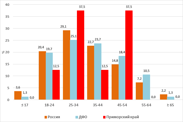 Рис. 5. Распределение по возрасту мигрантов, у которых был впервые выявлен ТБ, Россия, Дальневосточный федеральный округ и Приморский край, 2023 г., % Среди мигрантов, у которых в 2023 г. был впервые выявлен ТБ, доля самых молодых (≤ 17 лет) и старших групп (≥ 65 лет) была незначительной: если в России и ДФО она составляла не более 2,2 и 1,3 %, то в Приморском крае среди них случаев заболевания ТБ выявлено не было. Итак, результаты исследования показали, что участие мигрантов в формировании структуры пациентов с ТБ, выявленных впервые в ДФО в 2016-2023 гг., было незначительным и их доля составляла 1,4 % и была в 2,5 раза меньше по сравнению с их долей по России. При этом, доля мигрантов среди лиц мужского пола, у которых ТБ был впервые выявлен в 2016-2023 гг., также была незначительной, составляла 1,6 % и была в 2,4 раза меньше по сравнению с таковой по России. Доля мигрантов среди женщин, у которых ТБ был выявлен впервые в 2016-2023 гг., была совсем незначительной, составляла 0,9 % и была в 3 раза меньше по сравнению с таковой по России. Анализ участия мигрантов в формировании структуры пациентов с ТБ, впервые выявленных в Приморском крае в 2016-2023 гг. показал, что их доля была незначительной и в течение всего анализируемого периода составляла 1,0 %, что было в 3,5 и 1,4 раза меньше по сравнению с таковой по России и ДФО. Доля мигрантов среди лиц мужского пола, у которых ТБ был впервые выявлен в Приморском крае в 2016-2023 гг., также была незначительной, составляла 1,1 % и была в 3,5 и 1,5 раза меньше по сравнению с Россией и ДФО. В Приморском крае доля мигрантов среди женщин, у которых ТБ был впервые выявлен в 2016-2023 гг. составляла лишь 0,6 % и была в 4,5 и 1,5 раза ниже по сравнению с Россией и ДФО. Распределение по возрастам мигрантов, у которых ТБ был выявлен в 2023 г., различалось от такового среди постоянного населения за счет более высокой доли в группе 18-24 года, которая была равна по России - 20,4, по ДФО - 19,7 и Приморскому краю - 12,5 %. Доля возрастной группы 18-24 года среди постоянного населения России, ДФО и Приморского края была значительно ниже и колебалась в интервале от 4,0 до 4,8 %. Кроме того, среди мигрантов пиковое значение в возрастной пирамиде приходилось на группу 25-34 года и составляло по России - 29,1, ДФО - 25,1 и Приморскому краю - 37,5 %. Доля пациентов с ТБ среди самых молодых (≤ 17 лет) и старших групп (≥ 65 лет) по России и ДФО была равна лишь 2,2 и 1,3 %, а в Приморском крае случаи заболевания ТБ в этих группах отсутствовали. Таким образом, участие мигрантов в формировании структуры пациентов с ТБ, которые были выявлены в ДФО и Приморском крае в 2016-2023 гг. было незначительным, поскольку их доля была равна лишь 1,4 и 1,0 %. Доля мигрантов среди лиц мужского пола, у которых ТБ был впервые выявлен в ДФО и Приморском крае в 2016-2023 гг., также была незначительной и составляла 1,6 и 1,1 %, а среди женщин - 0,9 и 0,6 %. В настоящее время доля мигрантов в структуре впервые выявленных пациентов с ТБ в ДФО и Приморском крае является низкой и не оказывает существенного влияния на формирование числа впервые выявленных пациентов с ТБ, среди которых подавляющее число пациентов с ТБ было выявлено среди постоянного населения.