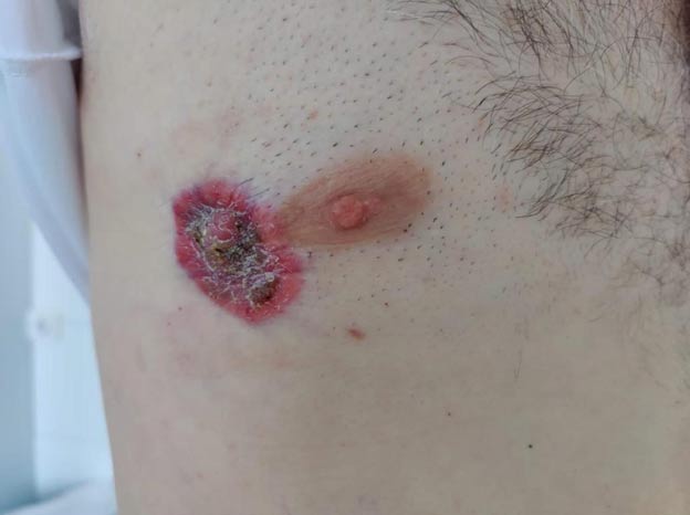 Рак молочной железы (РМЖ) занимает первое место в структуре заболеваемости и смертности женского населения РФ на протяжении многих лет. Среди мужского населения данная нозологическая форма встречается крайне редко и занимает одно из последних мест в структуре заболеваемости и смертности мужского населения (заболеваемость 0,19 % среди всех злокачественных новообразований и 517 случаев летальных исходов за период с 2020 по 2021 год) [1]. Особый интерес в терапии РМЖ у мужчин имеет хирургический этап лечения в связи с отсутствием достаточного объема мягких тканей и кожи, необходимых для закрытия дефекта после выполнения стандартной мастэктомии, особенно при местно распространенных формах заболевания. Использование в клинической практике методов реконструктивной и пластической хирургии при РМЖ, позволяет компенсировать недостаточный объем покровных тканей у мужчин переносом различных кожно-мышечных лоскутов, особенно при большом распространении первичного опухолевого процесса (размер опухоли более 5 см. (Т3) или выход опухолевого процесса на кожу (Т4))[2]. В "Краевом клиническом центре онкологии" г. Хабаровска за 2023-2024 годы зарегистрировано всего два случая лечения мужчин с местно-распространенной формой РМЖ после проведенной предоперационной полихимиотерапии, которые имели остаточную опухолевую массу в виде язвенных дефектов кожи и подлежащих тканей. Подобная ситуация требует значительного отступа от видимых границ зоны поражения и чаще всего не позволяет выполнить пластику местными тканями. В связи с этим было принято решение об использовании лоскутов широчайшей мышцы спины с кожными площадками для закрытия дефекта после мастэктомии.