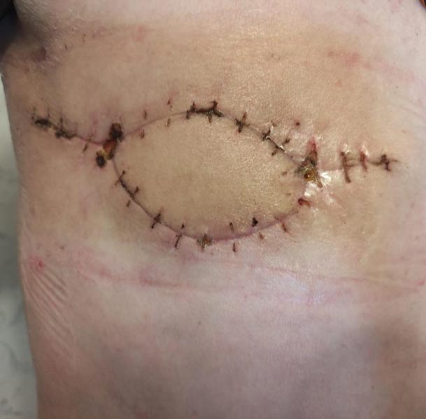 Рис. 1. Язвенный опухолевый дефект кожи пациента Л. после проведения курсов неоадъювантной полихимиотерапии Согласно заключению комиссии после проведенной химиотерапии показано выполнение хирургического этапа лечения. Мастэктомия по Мадден справа с пластикой лоскутом широчайшей мышцы спины с кожной площадкой выполнена 04.10.2023. Ход операции соответствует клиническому случаю описанному ранее. Гистологическое исследование № 7911/2023 - нейроэндокринная опухоль молочной железы 2 степени злокачественности, c инвазией в дерму и эпидермис молочной железы, с изъязвлением. Сосудистая и периневральная инвазия опухоли. Выраженная остаточная опухоль (RCB - III. ypT4bN2a). Метастазы нейроэндокринной опухоли в 4 из 5 найденных лимфатических узлов прилежащей жировой клетчатки. Ткань соска без очагов злокачественного роста. Окончательный диагноз после операции: С50.8 Нейроэндокринный рак правой молочной железы (cT4bN1M0/ypT4bN2aМ0 RCBIII) IIIB ст., трепанобиопсия, 4 курса полихимеотерапии (дозоуплотненное введение доксорубицина и циклофосфамида) + 4 курса химиотерапии (паклитаксела)), Оперативное лечение (мастэктомия по Мадден справа с пластикой широчайшей мышцы спины) Клиническая группа II. Окончательный вид после операции представлен на рисунке 2.