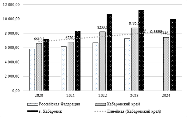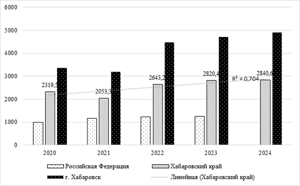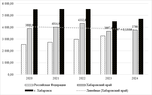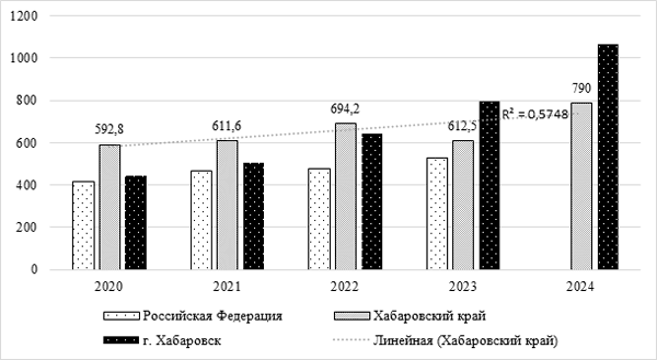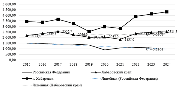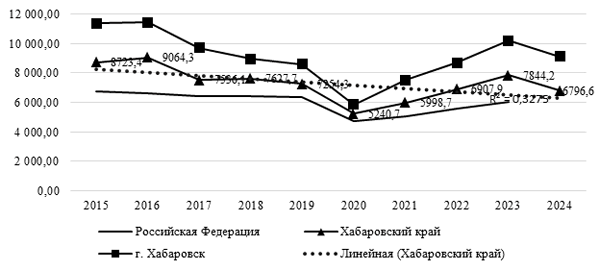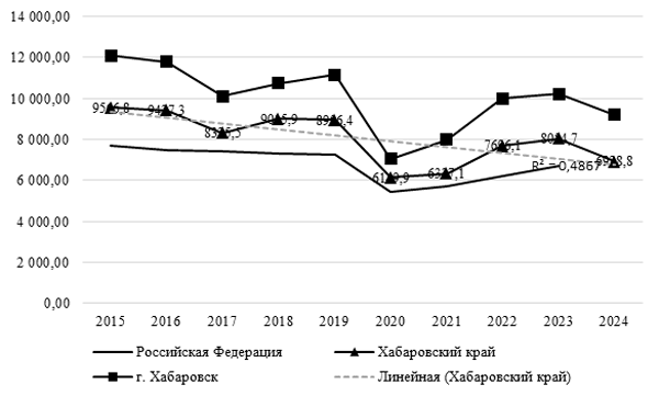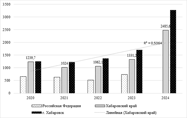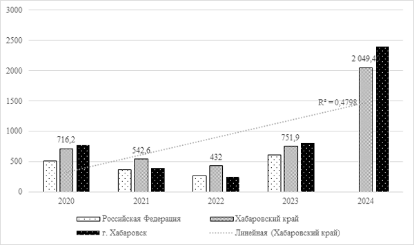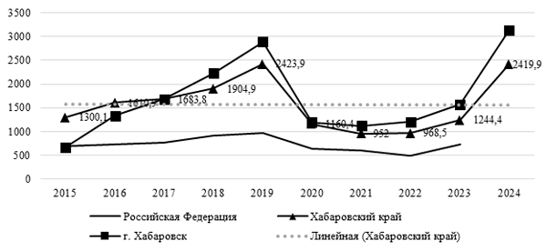 Согласно данным официальной статистики, в период с 2015 по 2024 год была проанализирована динамика показателей заболеваемости инфекционными и паразитарными болезнями среди детей и подростков в возрасте 0-17 лет, проживающих в городе Хабаровске и Хабаровском крае, в сравнении с общероссийскими показателями. Как демонстрируют представленные данные (рис. 1), за последнее десятилетие в указанном регионе сформировалась устойчивая тенденция к снижению заболеваемости данной патологией. Однако, несмотря на это, её уровень на протяжении всего наблюдаемого периода продолжал существенно превышать средние значения по Российской Федерации в целом.