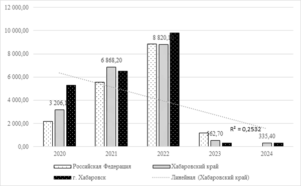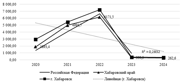 В частности, в промежутке 2017-2019 годов отмечался рост заболеваемости острыми кишечными инфекциями среди детского населения Хабаровска и края. Пиковое значение было зафиксировано в 2019 году в городе Хабаровске, достигнув 11168 случаев на 100 тысяч детского населения, что в 1,5 раза выше аналогичного общероссийского показателя за тот же год. В период пандемии, на фоне усиления противоэпидемических мероприятий и мер нефармацевтического характера, заболеваемость снизилась до исторического минимума как в целом по стране, так и в Хабаровском крае. В городе Хабаровске данный показатель составил 7064 на 100 тысяч детского населения. После завершения пандемии значения вновь продемонстрировали рост, однако в 2024 году, по сравнению с 2023 годом, наблюдается их снижение.