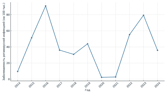 Проведенный ретроспективный анализ заболеваемости ротавирусной инфекцией среди детей в возрасте 0-14 лет в г. Ташкенте за 2014-2024 гг. выявил следующие особенности: