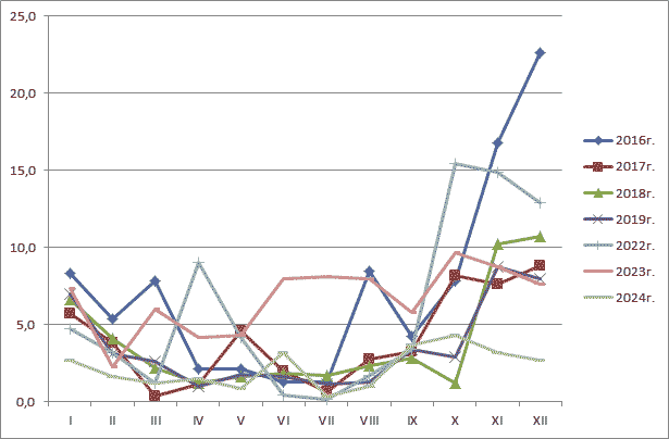 Рис. 2. Сезонность ротавирусной инфекции среди детей в возрасте от 0 до 14 лет в г. Ташкенте (2016-2024 гг.)